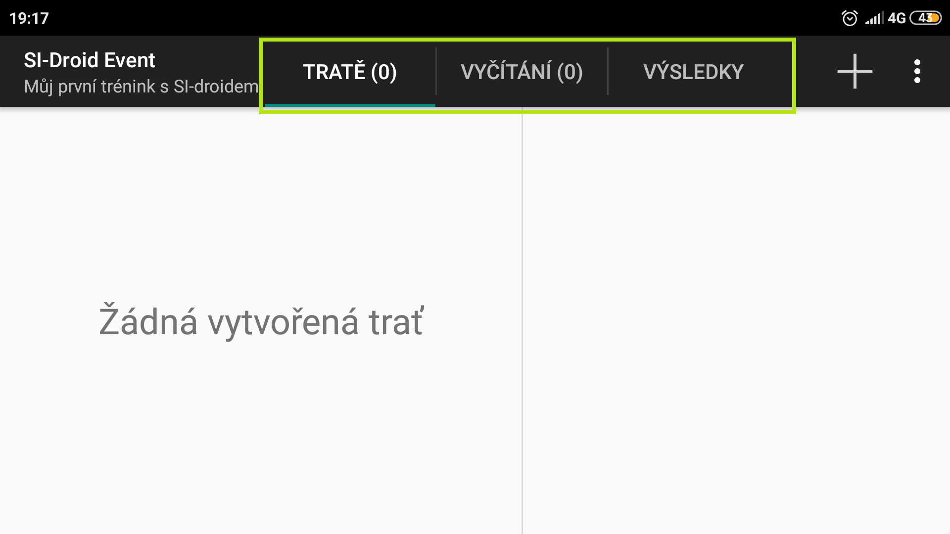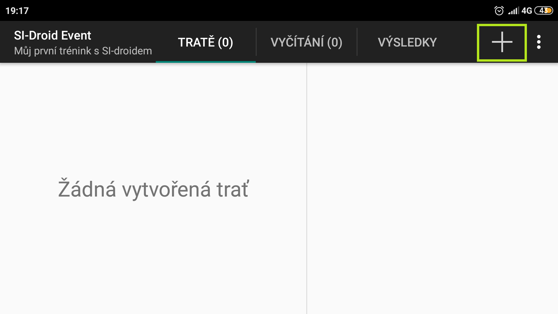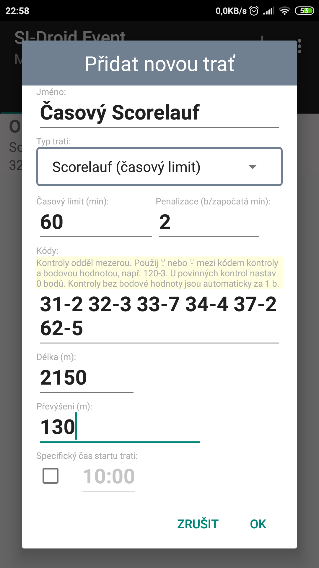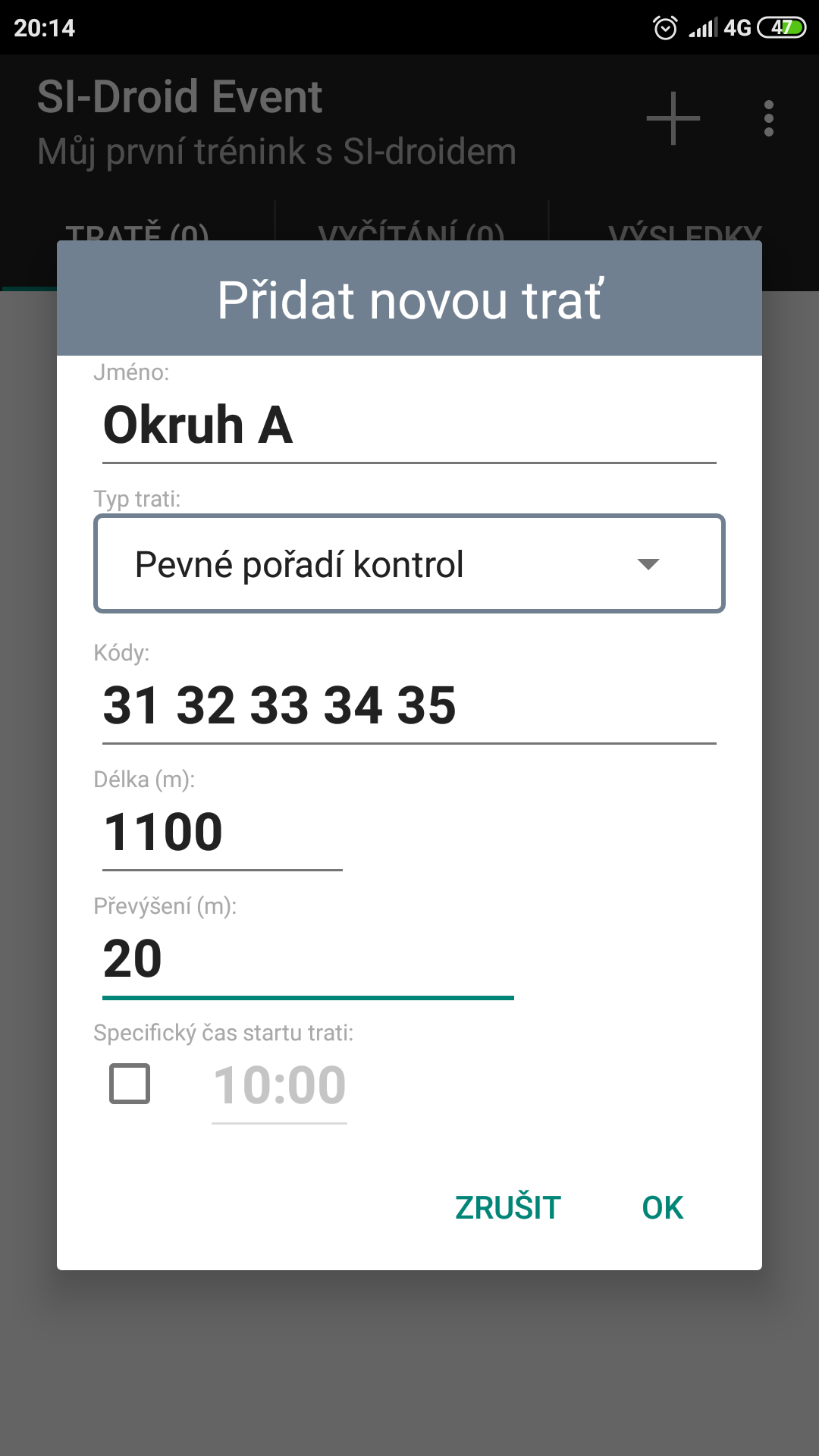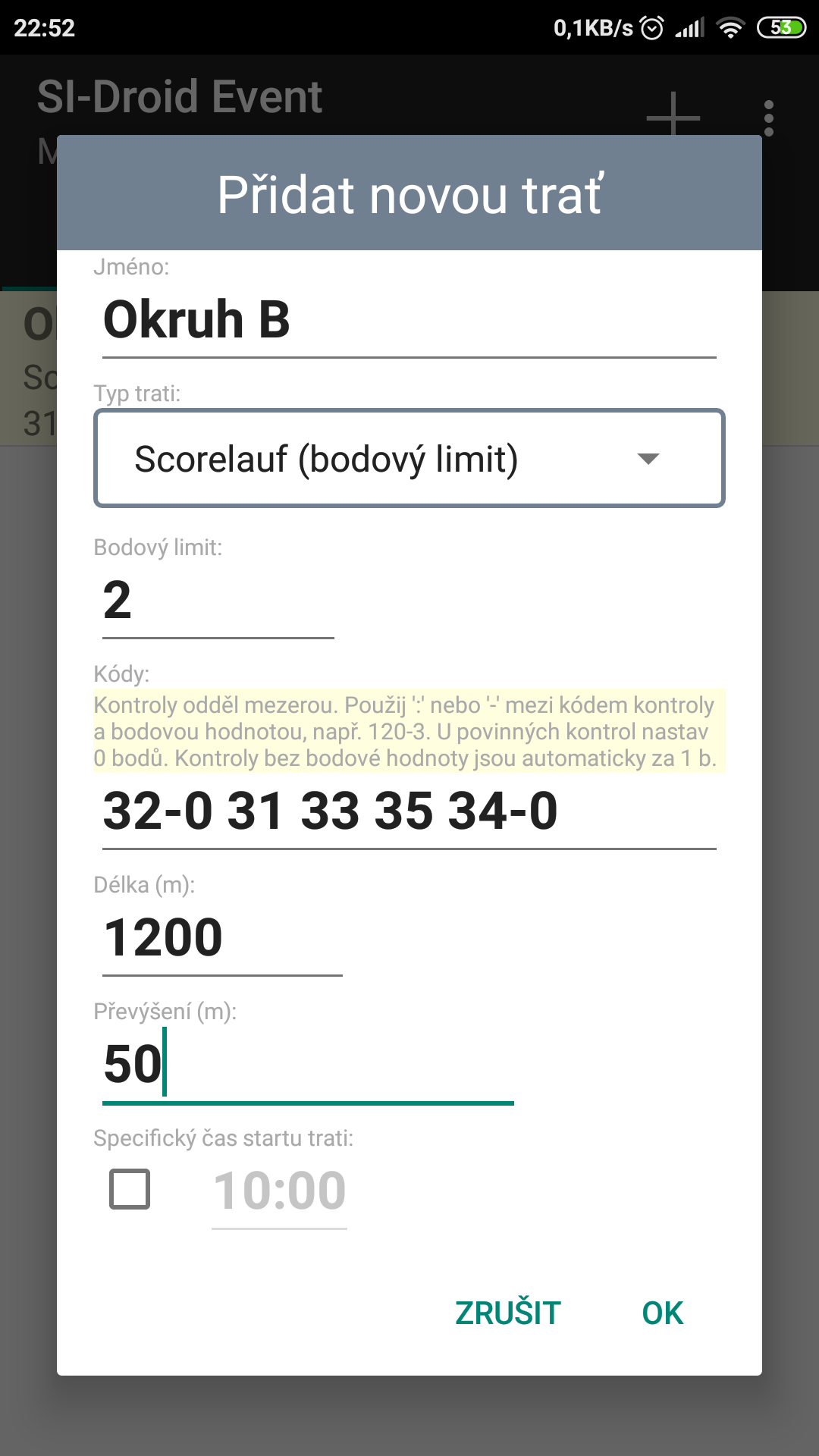 Novou trať přidáte kliknutím na plusko. Vyplníte kódy kontrol, které oddělíte mezerou. Poté doplníte dle potřeby další parametry nové trati, hlavně název a délku. Políčko Specifický čas startu trati slouží k hromadnému startu celé trati. Nová trať jde vytvořit také importem tratí z Ocadu nebo PurplePenu případně použitím záznamů ve vyčteném čipu.