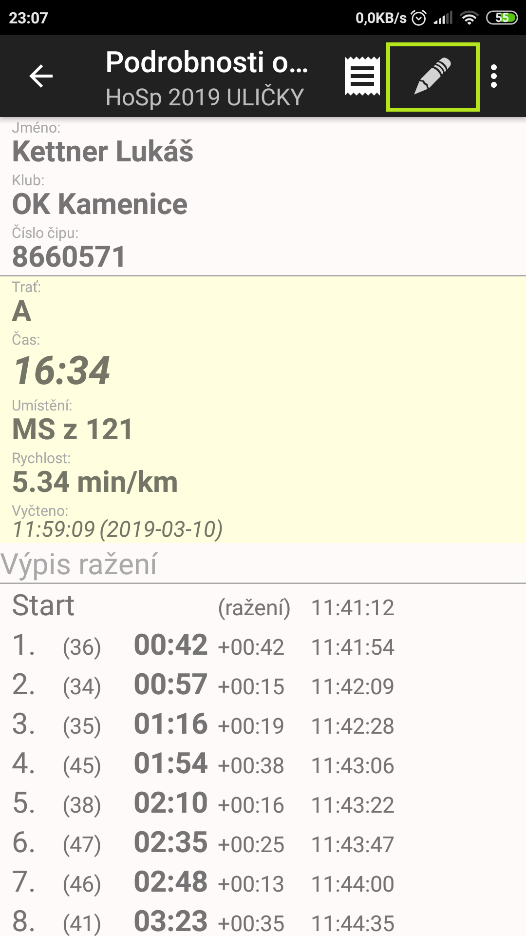 V tomto okně se zobrazují všechny vyčtené čipy. Nově vyčtený je oranžově zvýrazněn a objeví se vždy na prvním řádku. Vyčtenému závodníkovi můžeme po rozkliknutí přes tlačítko tužky v horním menu změnit jednotlivé atributy včetně ražení!!! Pro změnu ražení je potřeba kliknout na malou nenápadnou šipku a tím se ukáží všechna ražení závodníka. Pluskem jdou přidávat a košem mazat. Při editaci časů je nutné vyplnit všechna políčka - hodiny, minuty i vteřiny a to i v případě, že chceme celou hodinu. Nuly se automaticky nedoplní.