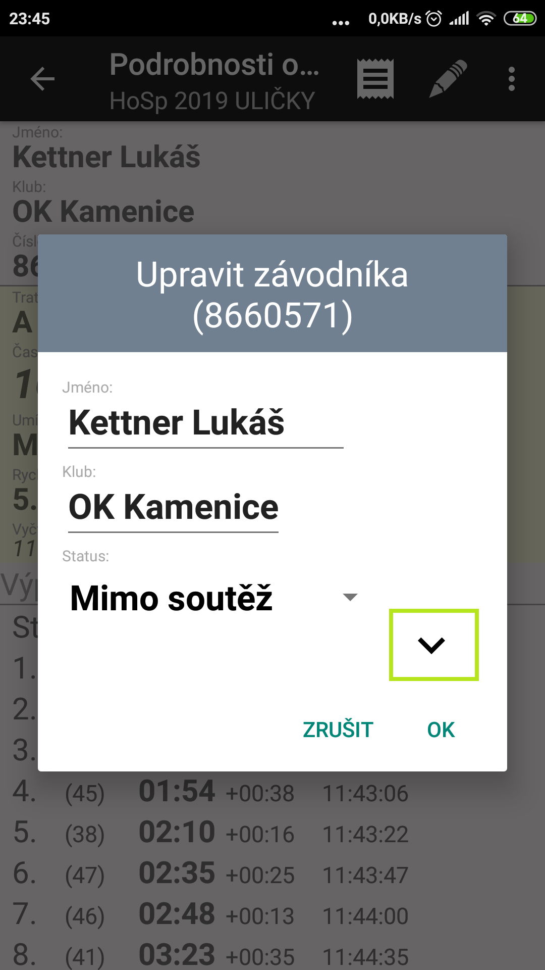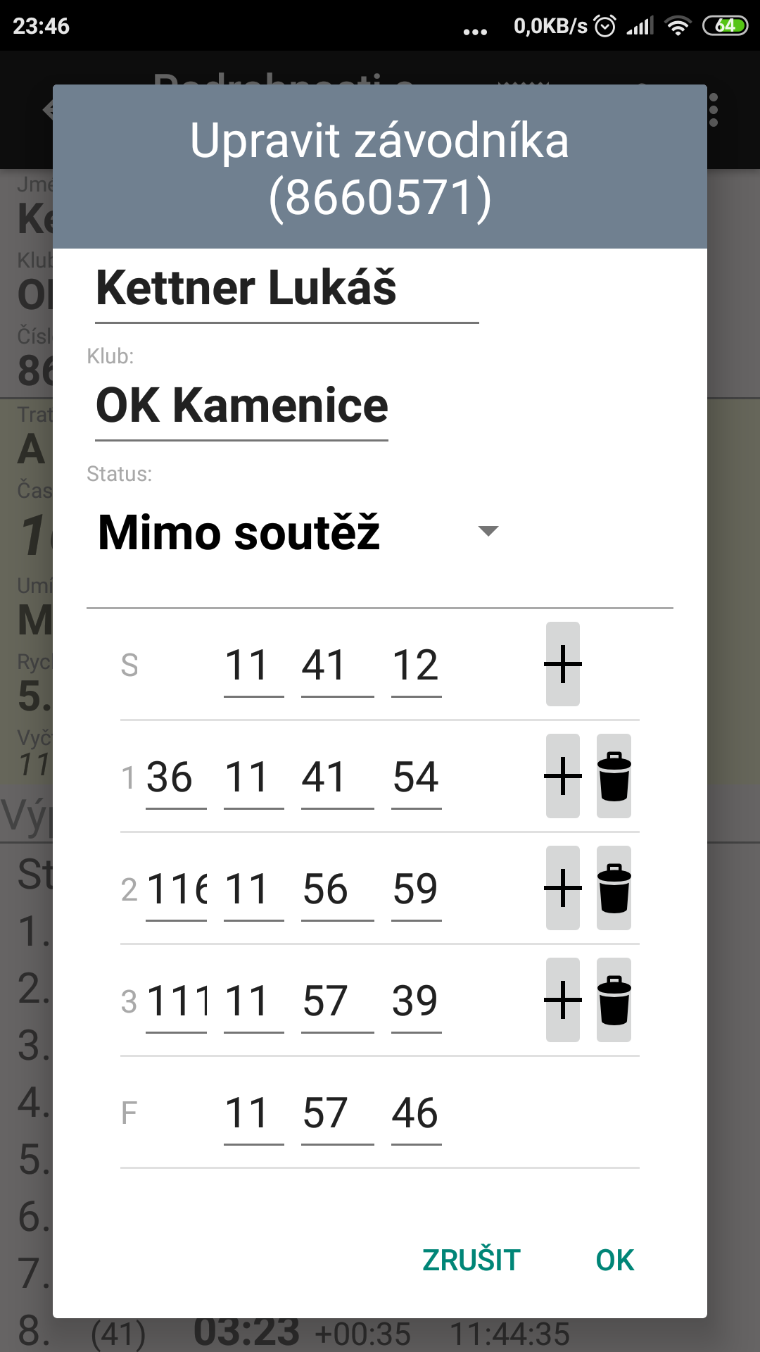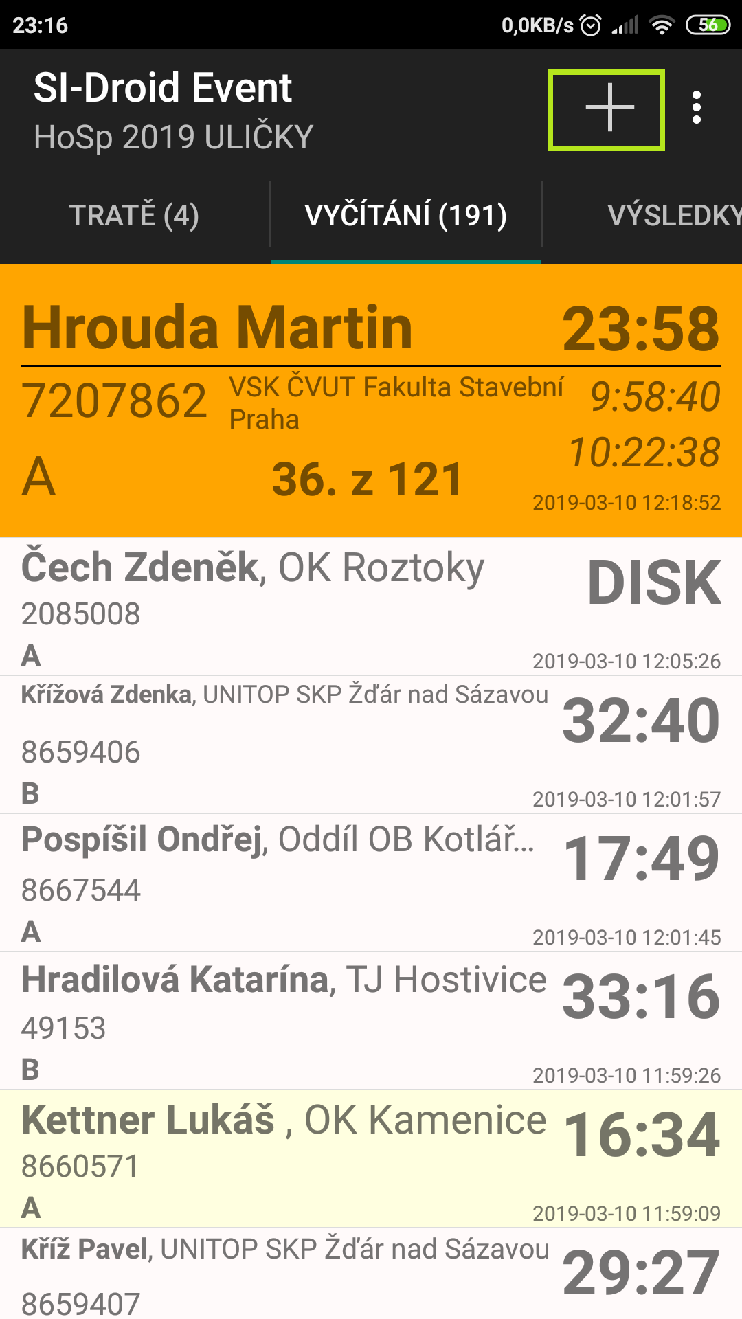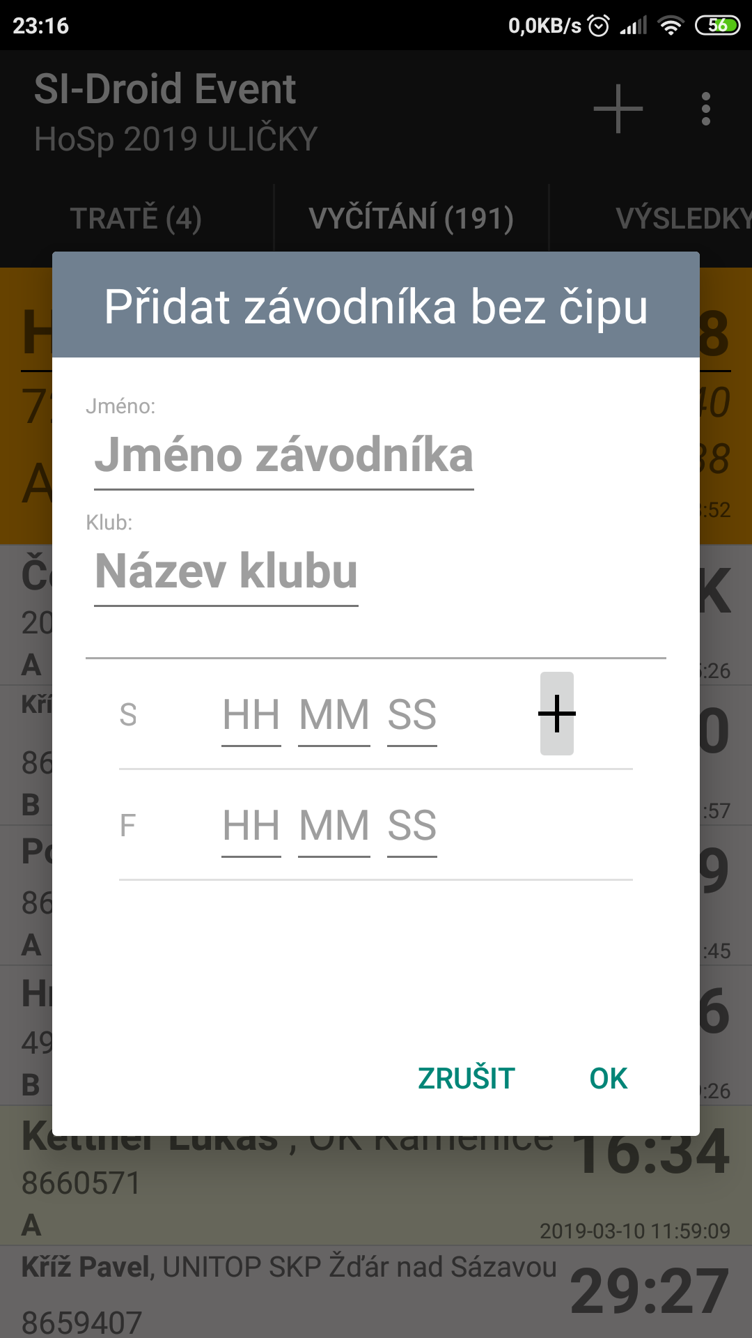 Ikona plus zde slouží k přidání závodníka bez čipu. Stačí vyplnit jméno, doplnit čas startu, čas cíle a potvrdit. Poté závodníka rozkliknout, změnit mu trať a status ručně na OK. Jednoduché a praktické.