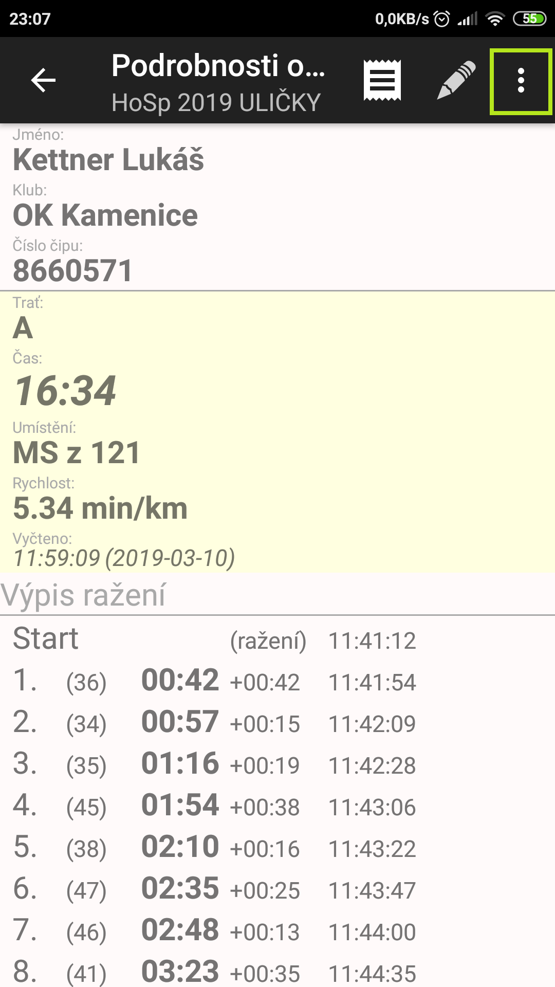 Nově přibyla možnost vytisknout celkové výsledky na bluetooth tiskárně, která se musí nejdříve v nastatení spárovat, aby se ikona tisku (účtenky) zobrazila. Aktuálně je možné vytisknout pouze výsledky všech tratí. Občas je to hooodně dlouhý papírek, tak pozor.