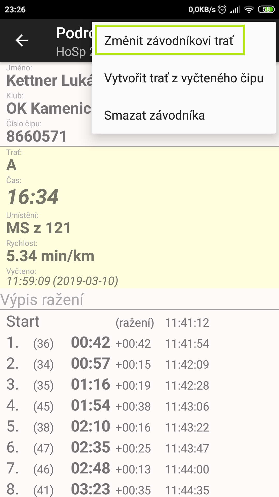 Úprava závodníka Úprava závodníka menu Úprava závodníka ražení