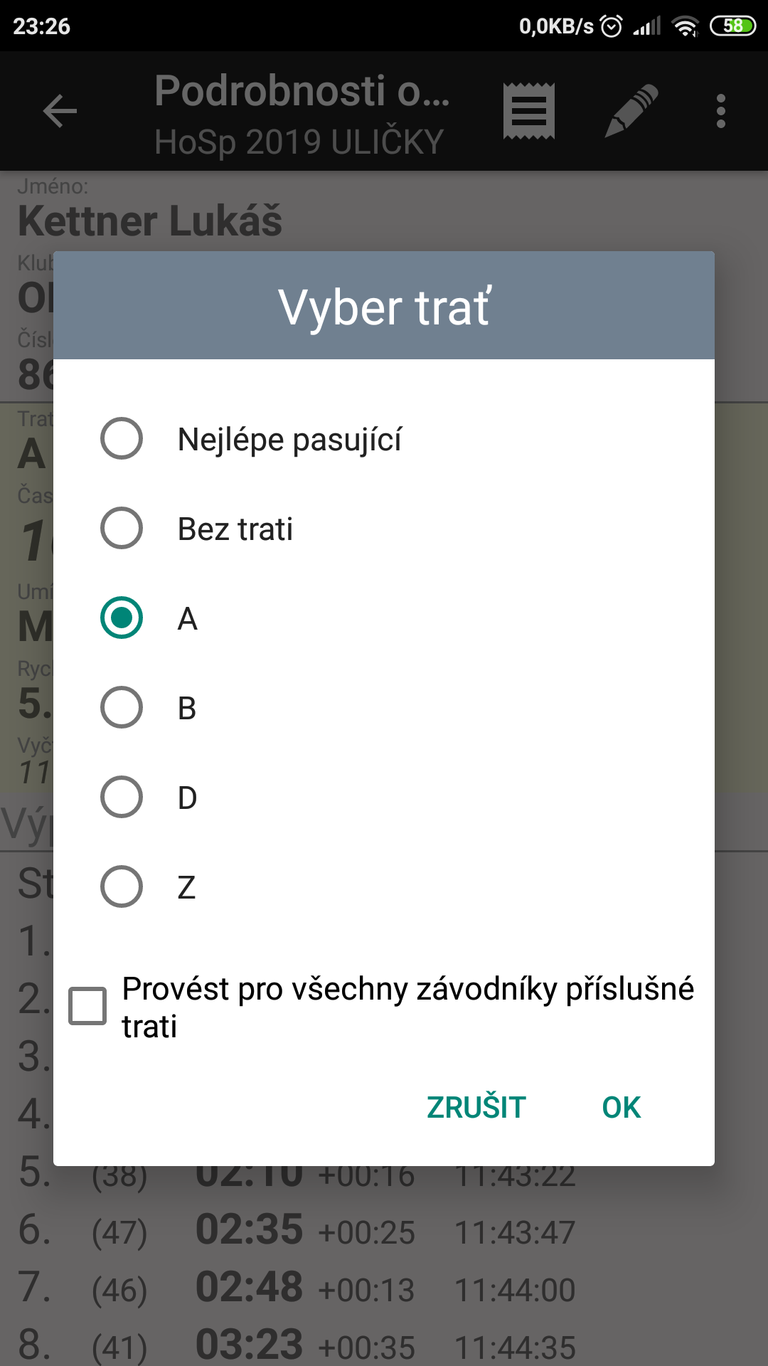 Trať se přiřadí automaticky podle nejlépe pasující. Po rozkliknutí závodníka je možné trať ručně změnit nebo zvolit nejlépe pasující trať. Šikovná možnost je Provést pro všechny závodníky příslušné trati. Jde tak hromadně změnit trať všem závodníkům v případě úpravy trati v záložce TRATĚ.