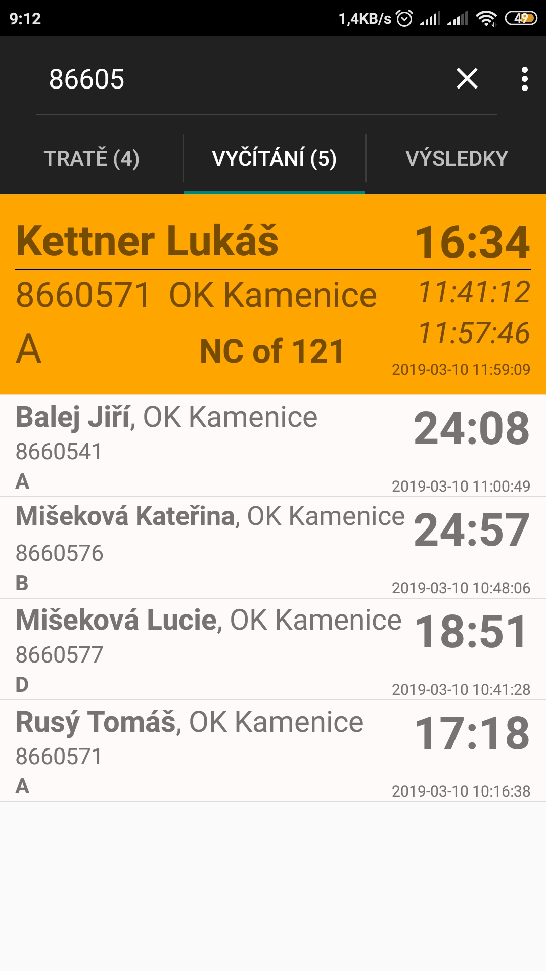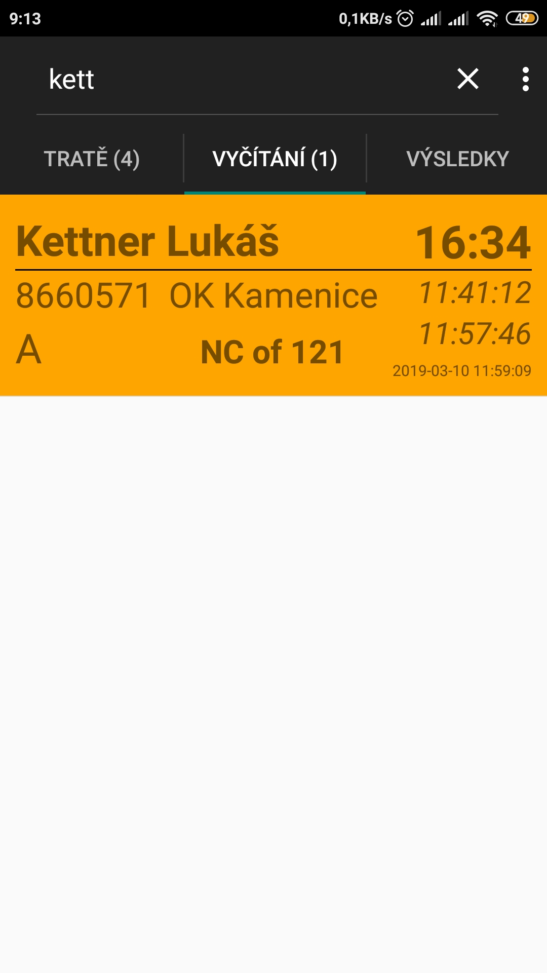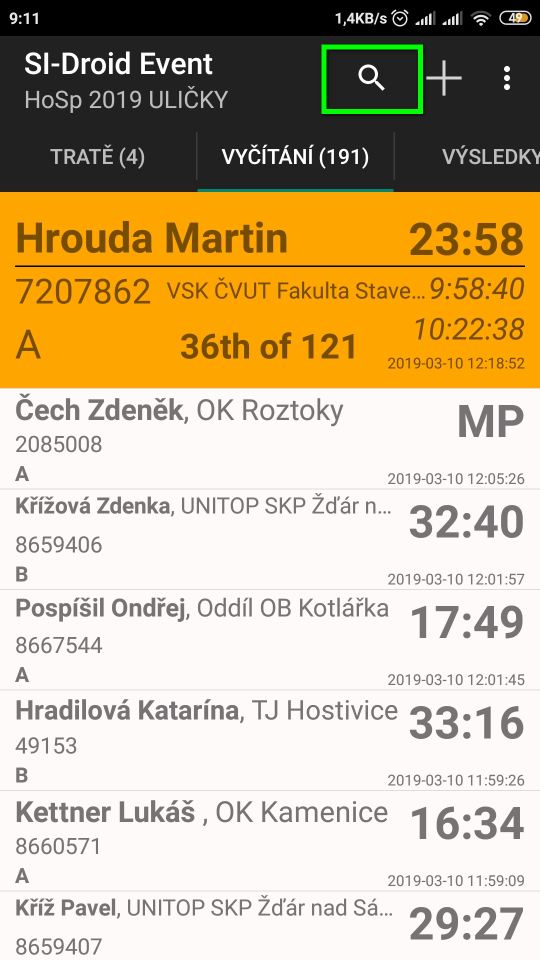 Nově je v horní části okna přidané vyhledávací okno, které umožňuje filtrovat seznam vyčtených závodníků pouze podle jména závodníka nebo čísla čipu. Stačí kliknout na ikonu lupy a objeví se vyhledávací okno. Číslo X v závorce – VYČÍTÁNÍ (X) – zobrazuje počet výsledků odpovídajících filtru.