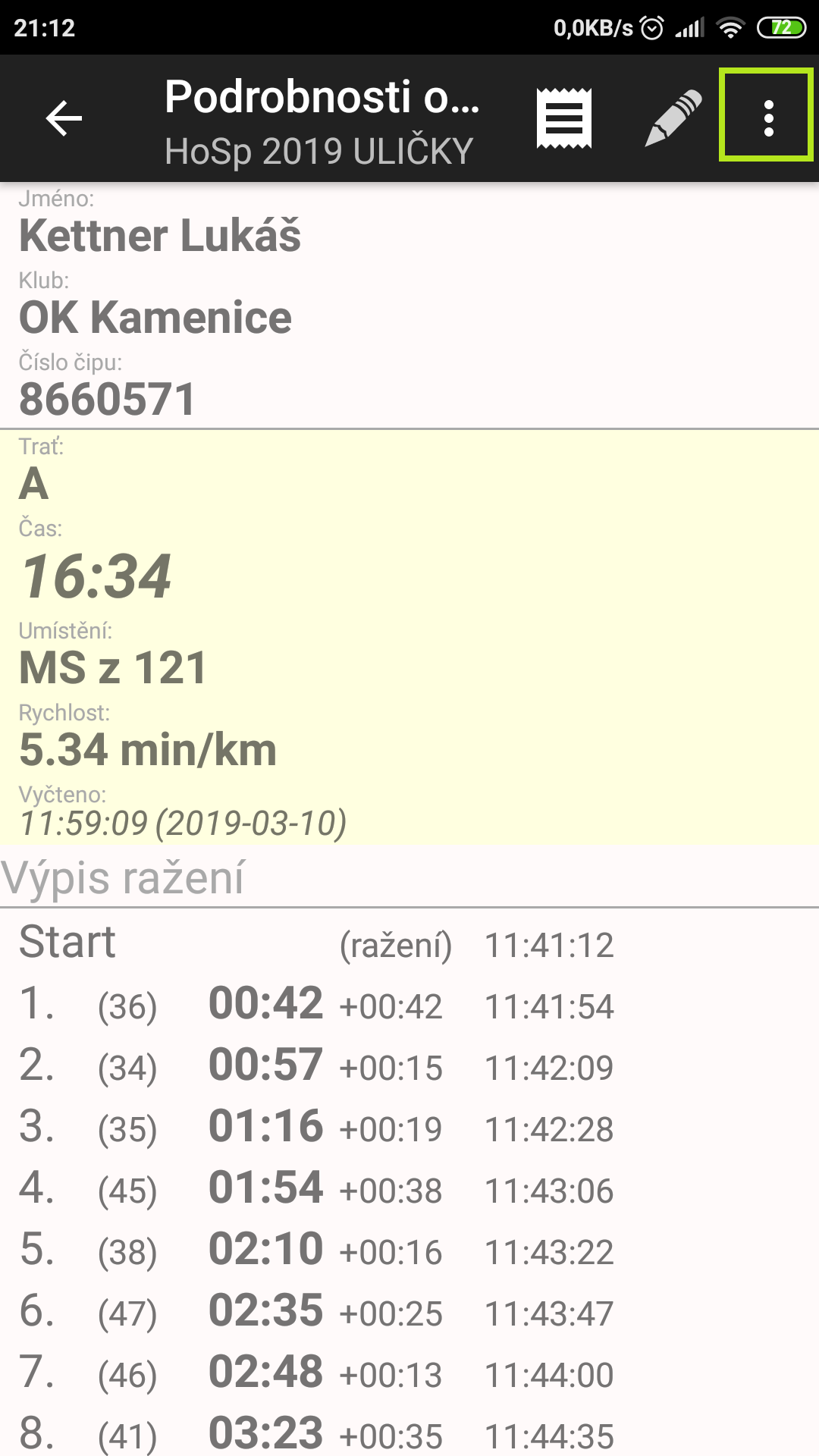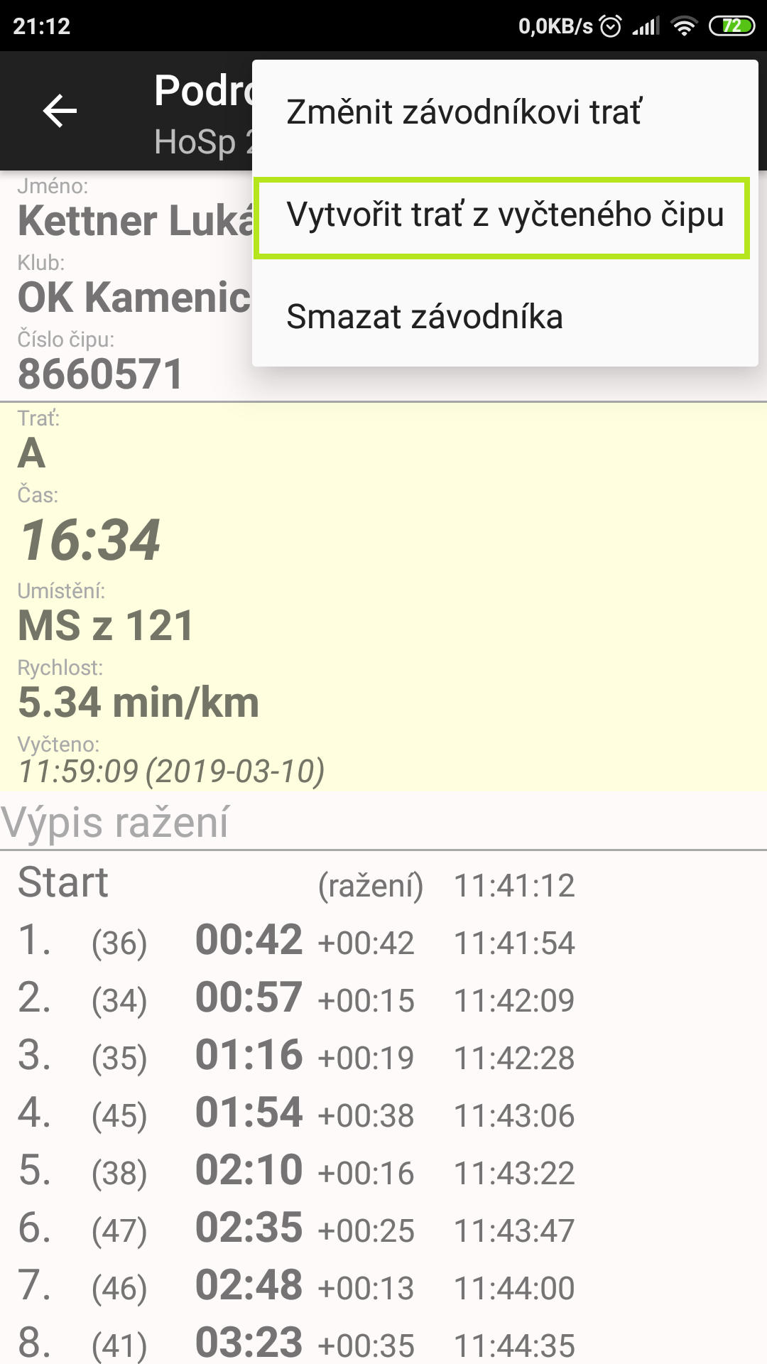 Další možností vytvoření nové tratě je použití vyčteného čipu. To se provede v záložce VYČÍTÁNÍ, kde si vybereme vyčtený čip, ze kterého chceme udělat novou trať, a v pravém horním rohu opět přes tři tečky vybereme možnost Vytvořit trať z vyčteného čipu. Trať můžeme před uložením ještě upravit – nejčastěji jméno (vytvoří se dle čísla čipu) a délka.