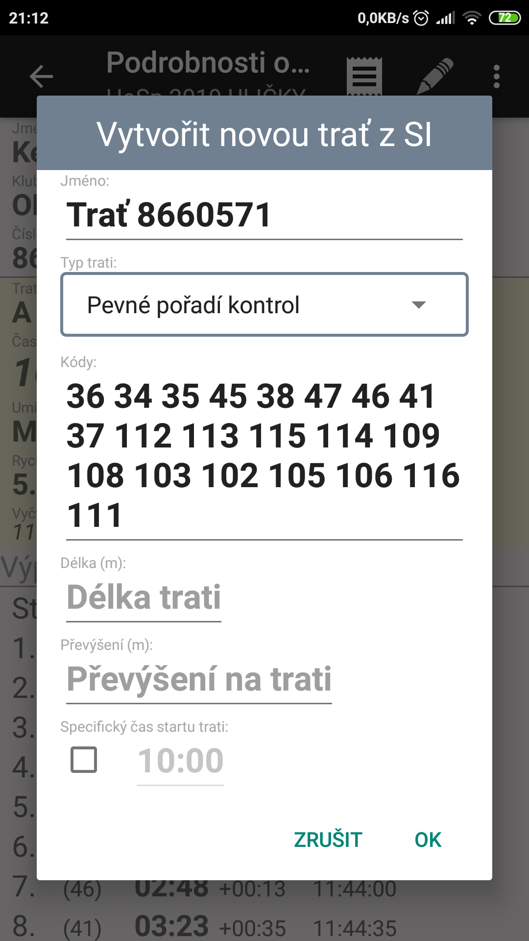 Kromě ručního zadání kódů kontrol můžete tratě nahrát z xml souboru, který vyexportujete z Ocadu nebo PurplePenu a následně otevřete v aplikaci. V záložce TRATĚ kliknete do pravého horního rohu na tři tečky a vyberete Import tratí. Pozor na názvy tratí s diakritikou, ta se zatím neimportuje správně a je nutné název ručně opravit.