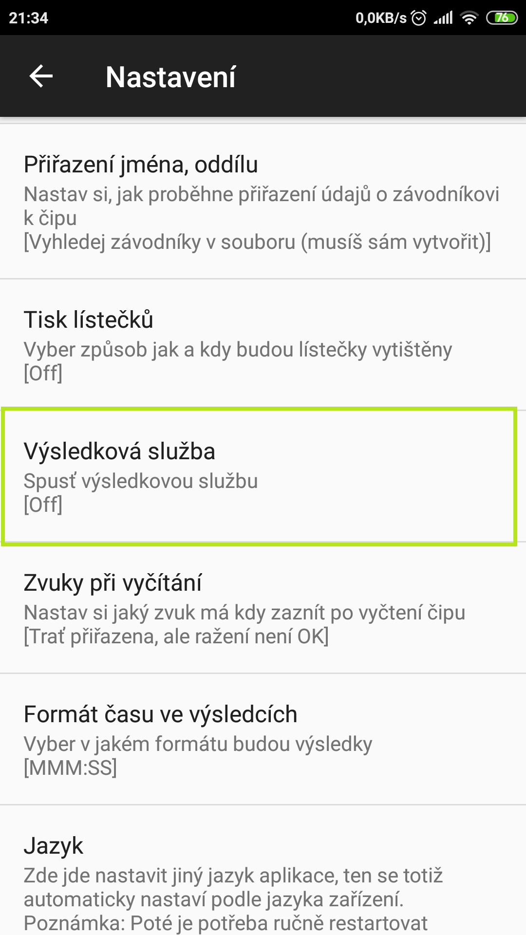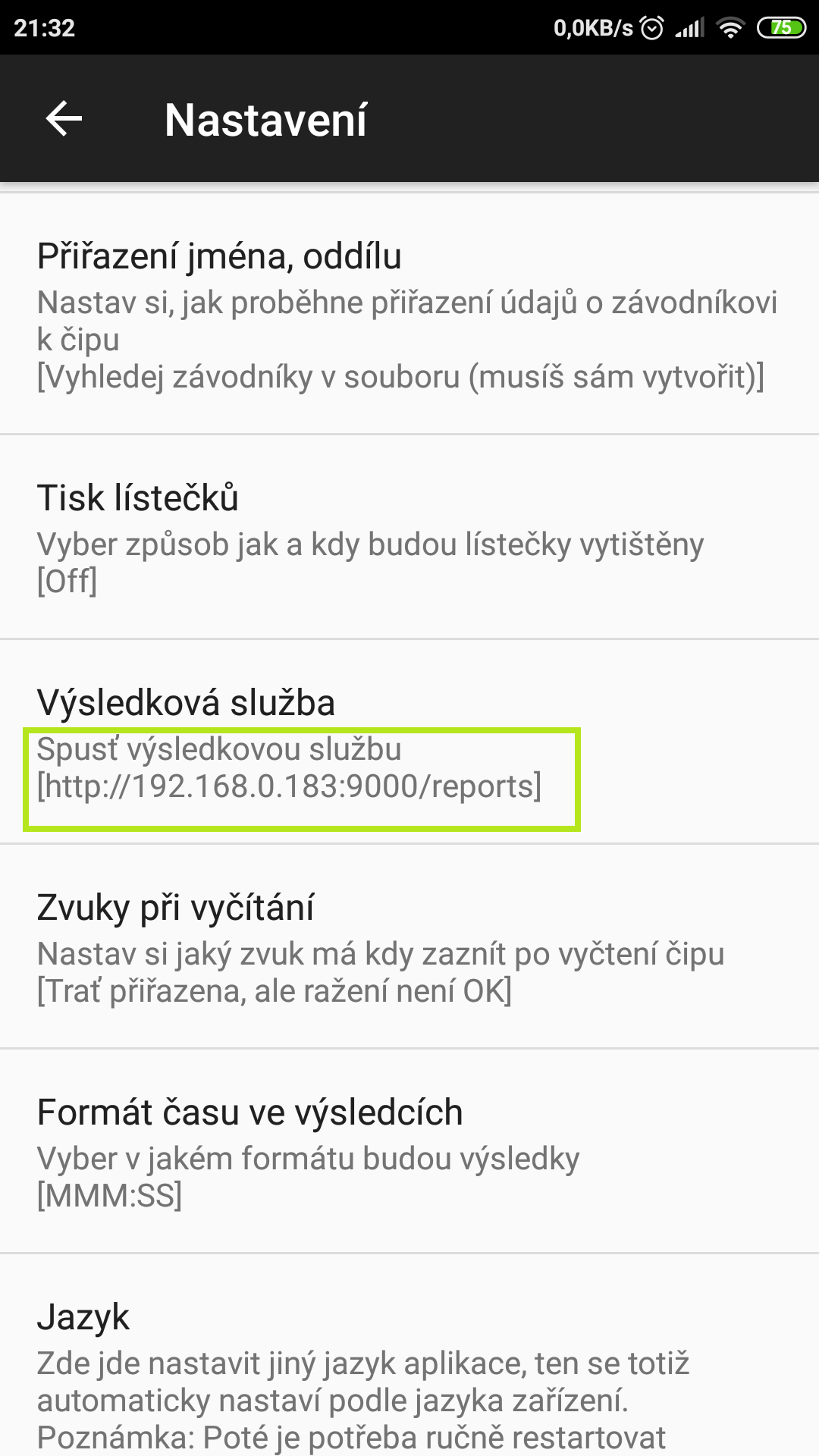Zapnutí se provede v nastavení pod možností Výsledková služba, port výsledkové služby není obzvlášť důležitý. Adresa výsledků se zobrazí po vyskočení o úroveň výš v nastavení - např. http://192.168.0.183:9000/reports nebo http://100.95.11.78:8000/reports.