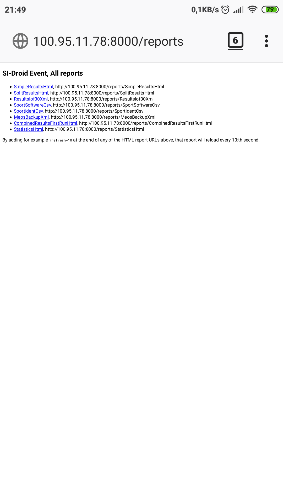 Po připojení k vytvořené síti zapnete internetový prohlížeč a zadáte adresu výsledků. Z menu si stačí vybrat jaké výsledky chcete zobrazovat (nejčastěji SimpleResults - obyčejné bez mezičasů). Když v adresovém řádku přidáme ?refresh=10 na konec url adresy, budou se výsledky samy každých 10 sekund obnovovat (hodnotu si můžeš libovolně upravit). Kompletní adresa pro zobrazení jako na obrázku je: http://100.95.11.78:8000/reports/SimpleResultsHtml?refresh=10.