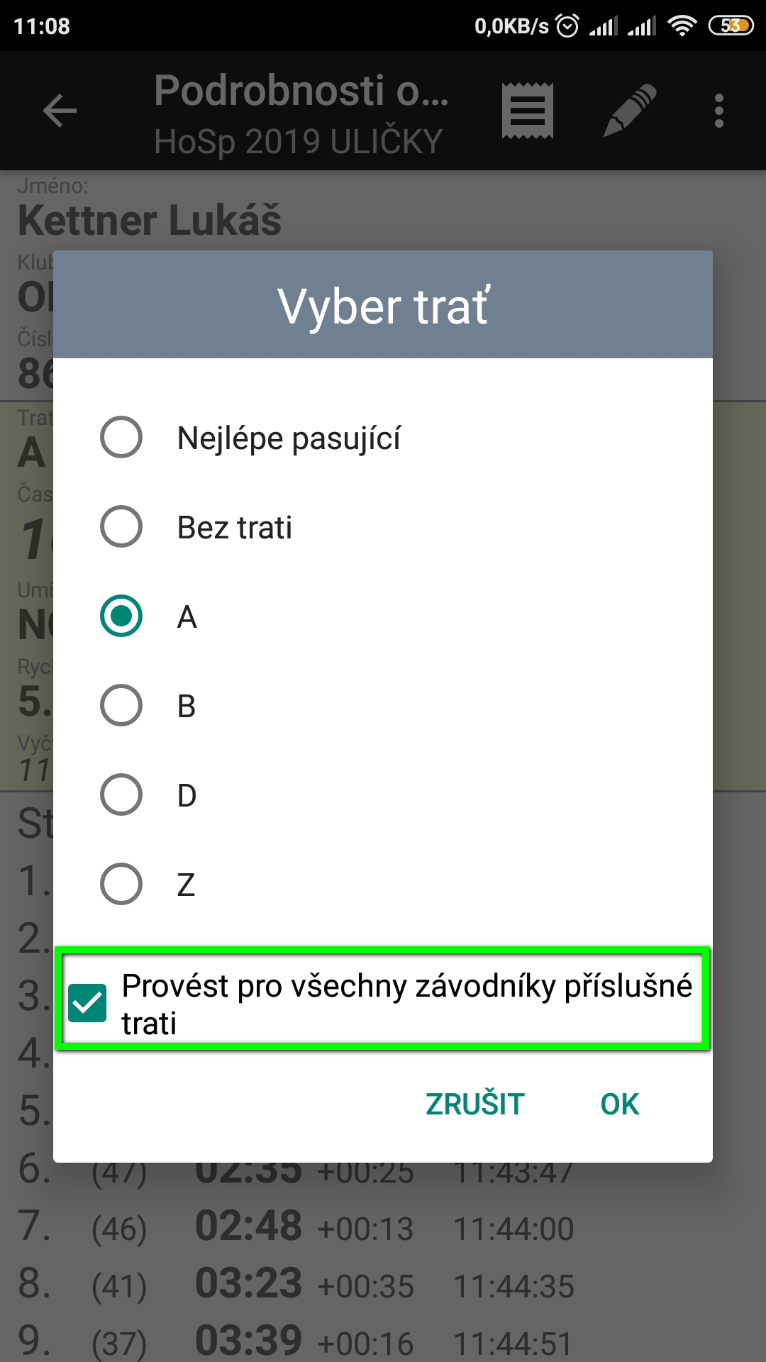 Může se stát, že se během tréninku změní vlastnosti trati – kódy kontrol, bodové hodnocení a my máme už vyčtené nějaké závodníky. Pro tyto případy je tu checkbox Provést pro všechny závodníky příslušné trati, který je v dolní části okna Vyber trať. Nejčastěji jsem ho využil u skorelaufu. Umožňuje hromadnou změnu u všech závodníků na jedné trati.