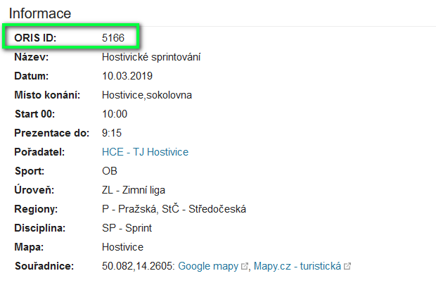 Stačí si v ORISU zjistit ID závodu (čtyřciferné číslo). Číslo je na hlavní stránce závodu v části Informace hned na prvním řádku - ORIS ID.
