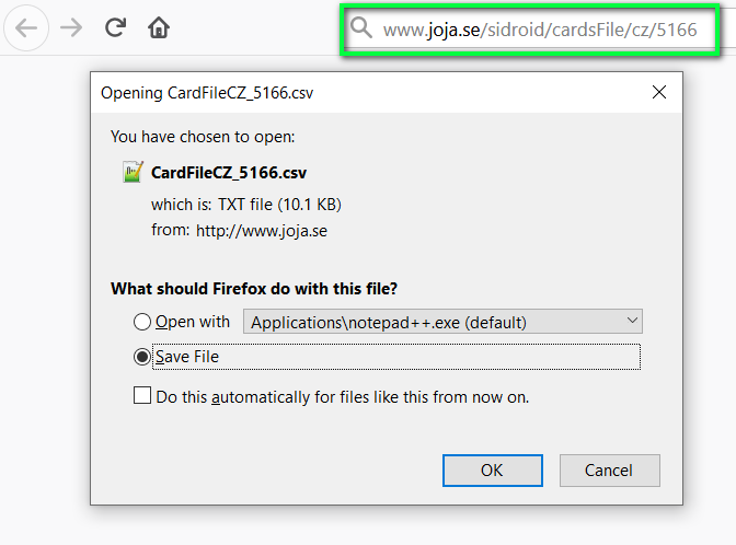 Po stisknutí entru dojde k automatickému spuštění stahování textového suboru, který byl vygenerovaný. Soubor se pojmenuje CardFileCZ_<ORIS ID>.csv – ke jménu je připojeno id závodu pro přehlednost. Poté stačí stažený soubor přenést do paměti zařízení a v nastavení aplikace soubor přiřadit.